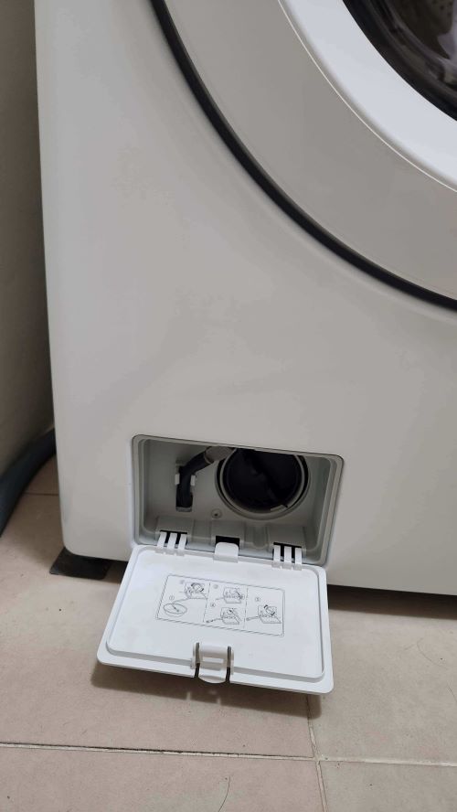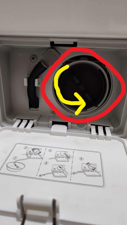배수 필터는 세탁기 하단부에 조그마한 문이 있고 열어보면 동그랗게 돌리는 마개가 있습니다. 이것을 돌려 열고 이물질을 제거해 주시면 됩니다. 아래 사진을 참조해 주세요.
